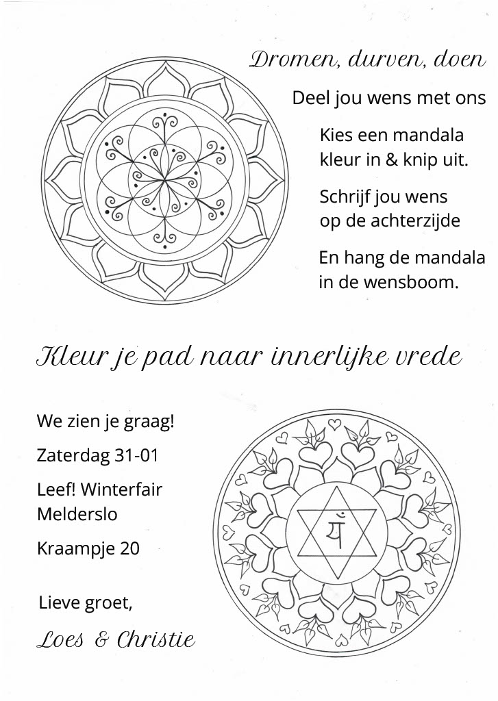 Geen tijd om naar de Winterfair te komen en je wilt toch meedoen? Je kunt je mandala en wens ook opsturen en dan hangen wij hem in de wensboom voor je.